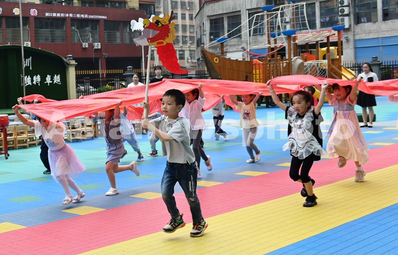 图片说明:2022年 6月2日,湖南省邵阳市洞口县文昌街道智雅星幼儿园,小朋友们在开展旱地赛龙舟比赛。