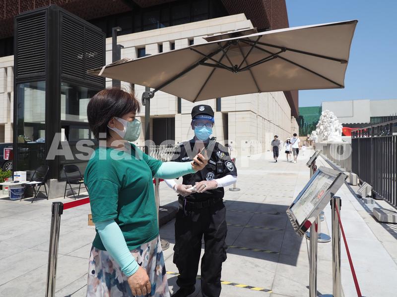 2022年6月2日,中国工艺美术馆、中国非物质文化遗产馆入口处,观众在扫描行程码、健康码。