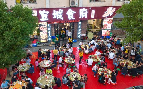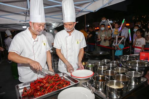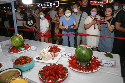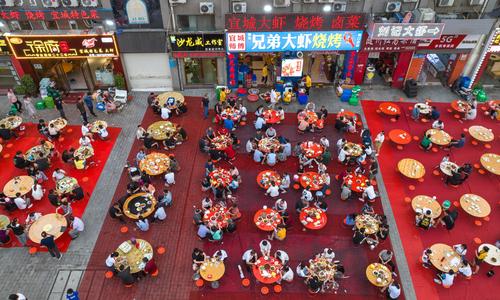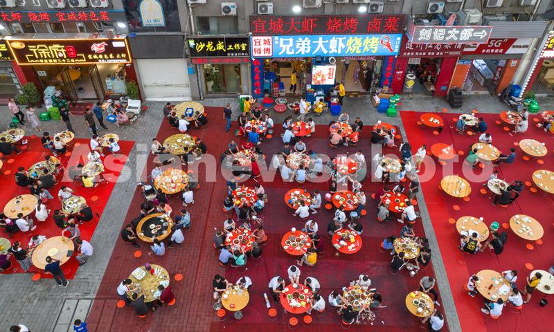 图片说明:2022年6月2日,湖北省襄阳市,襄城区闸口大虾一条街热闹开街,吸引了众多市民品尝小龙虾,享受夏日夜市的美味。