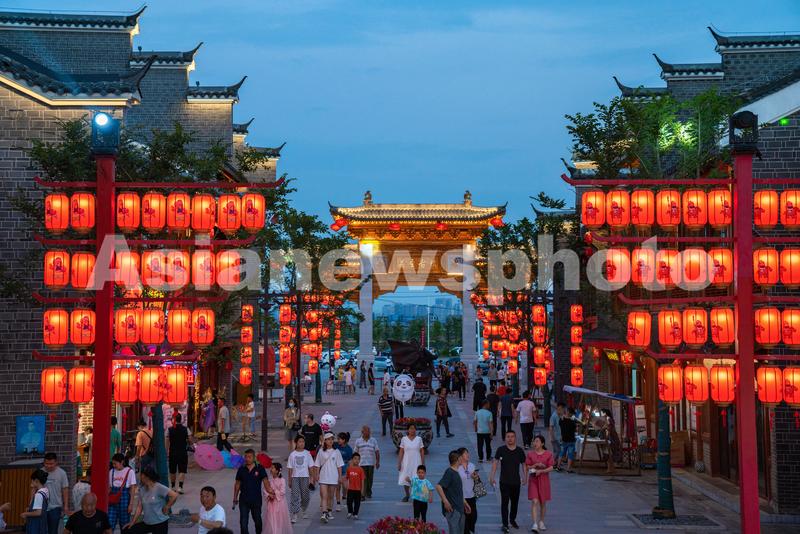 图片说明:2022年6月3日,湖北省襄阳市,樊城区关圣古镇旅游景区流光溢彩,吸引了众多市民前来游玩。