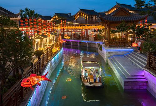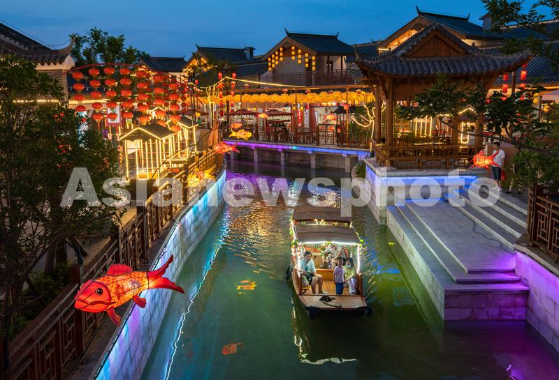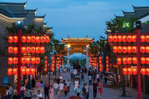 图片说明:2022年6月3日,湖北省襄阳市,樊城区关圣古镇旅游景区流光溢彩,吸引了众多市民前来游玩。