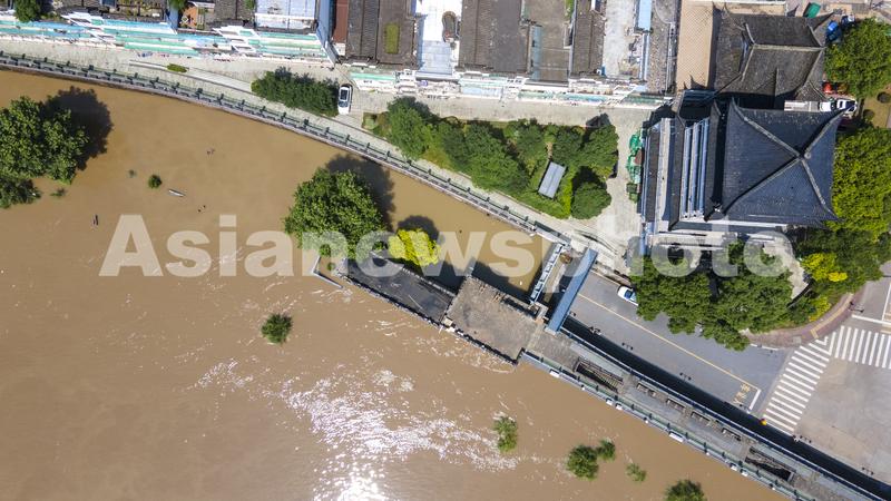 图片说明:2022年6月6日下午,航拍浙江省金华市兰江水域,钱塘江2022年1号洪水正安全过境(无人机照片)。