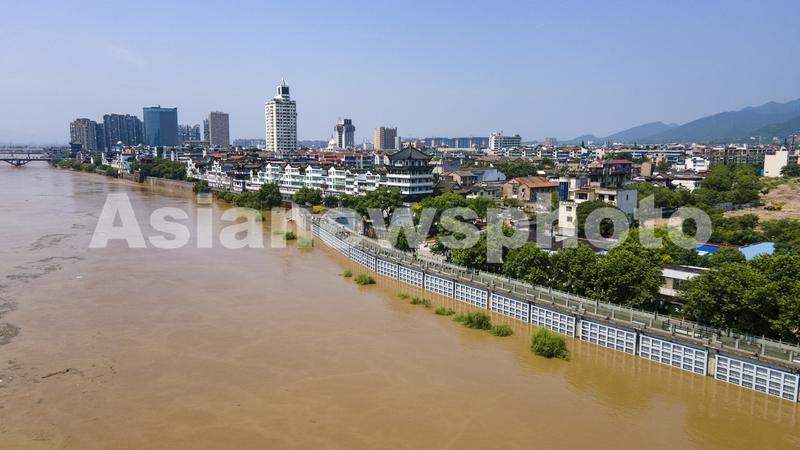 图片说明:2022年6月6日下午,航拍浙江省金华市兰江水域,钱塘江2022年1号洪水正安全过境(无人机照片)。