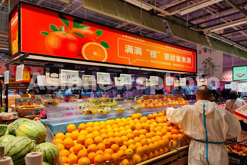 图片说明:2022年6月6日,上海,杨浦区大润发超市在入口处打出“福”和“再见你真好”的字样,超市内顾客众多。