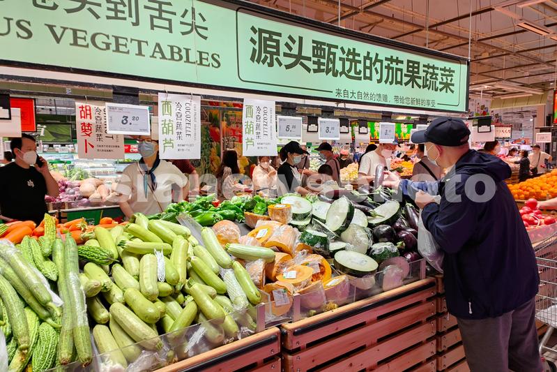 图片说明:2022年6月6日,上海,杨浦区大润发超市在入口处打出“福”和“再见你真好”的字样,超市内顾客众多。