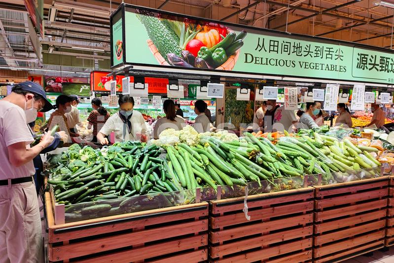 图片说明:2022年6月6日,上海,杨浦区大润发超市在入口处打出“福”和“再见你真好”的字样,超市内顾客众多。