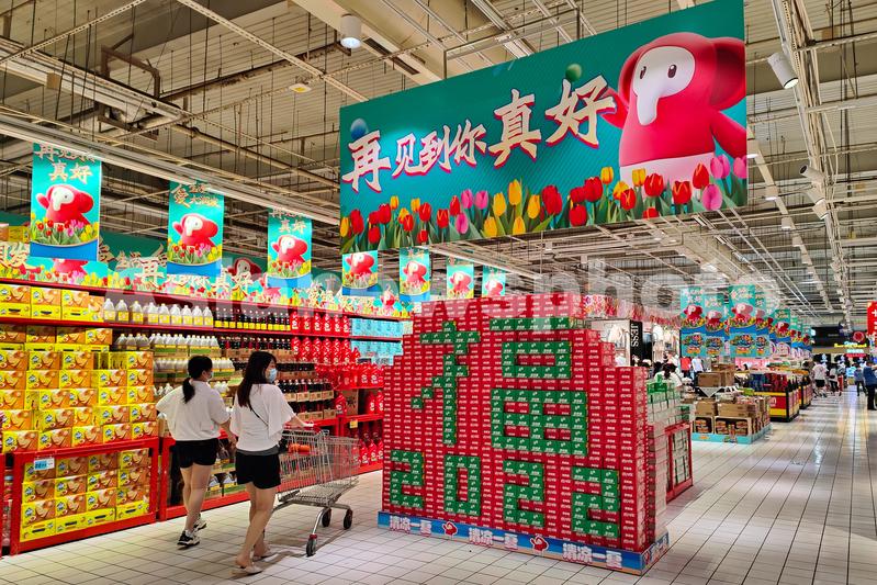 图片说明:2022年6月6日,上海,杨浦区大润发超市在入口处打出“福”和“再见你真好”的字样,超市内顾客众多。
