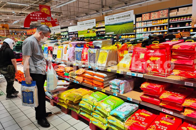 图片说明:2022年6月6日,上海,杨浦区大润发超市在入口处打出“福”和“再见你真好”的字样,超市内顾客众多。