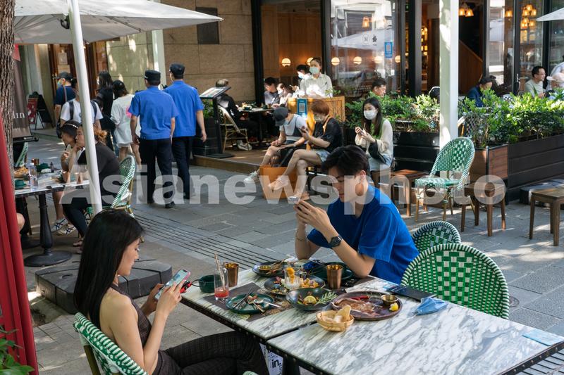 6月8日下午,顾客在上海新天地商圈户外用餐区享用下午茶