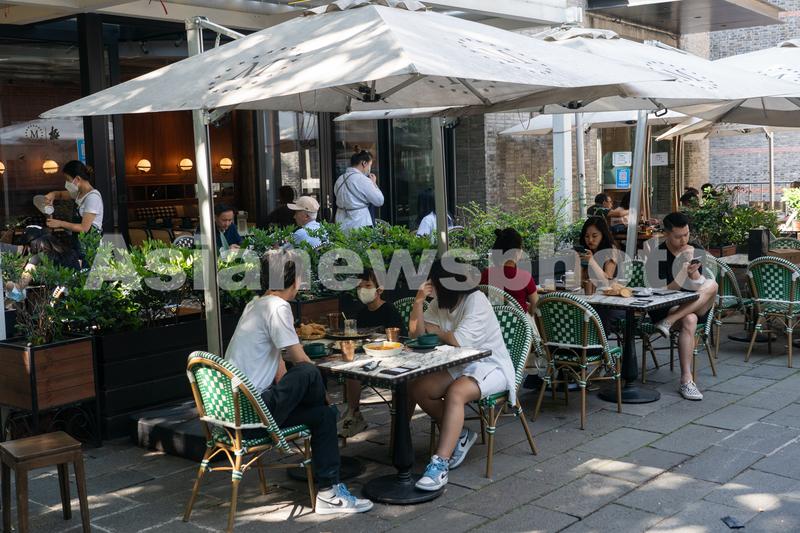 6月8日下午,顾客在上海新天地商圈户外用餐区享用下午茶