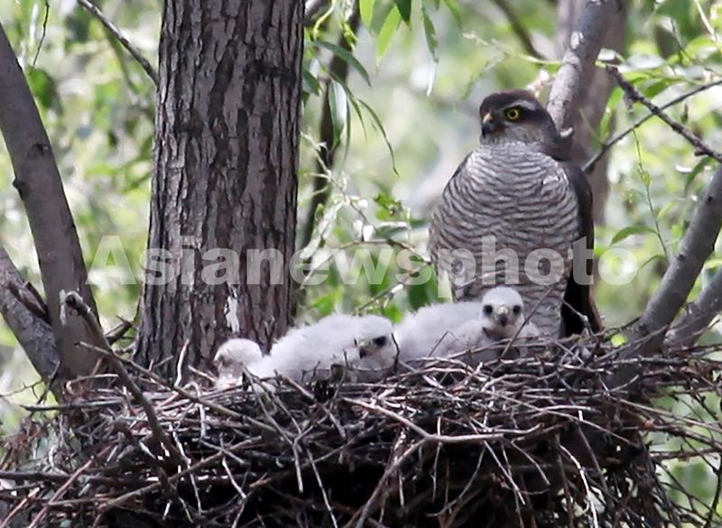 2022年6月9日,沈阳南湖公园北侧的湖心岛上国家二级保护动物雀鹰正在哺育幼鸟。