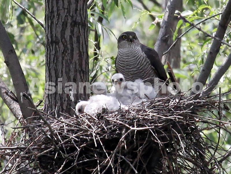 2022年6月9日,沈阳南湖公园北侧的湖心岛上国家二级保护动物雀鹰正在哺育幼鸟。