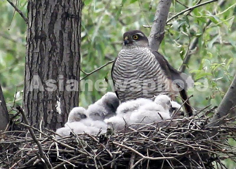2022年6月9日,沈阳南湖公园北侧的湖心岛上国家二级保护动物雀鹰正在哺育幼鸟。