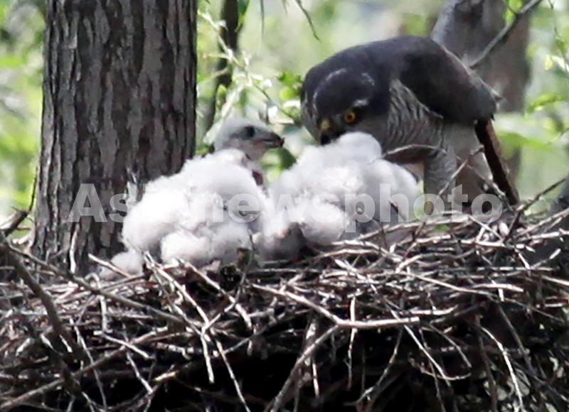2022年6月9日,沈阳南湖公园北侧的湖心岛上国家二级保护动物雀鹰正在哺育幼鸟。