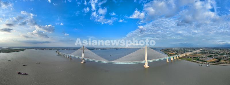 2022年6月10日,江苏南通,无人机航拍沪苏通长江公铁大桥画面。
