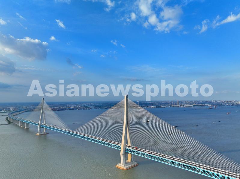 2022年6月10日,江苏南通,无人机航拍沪苏通长江公铁大桥画面。