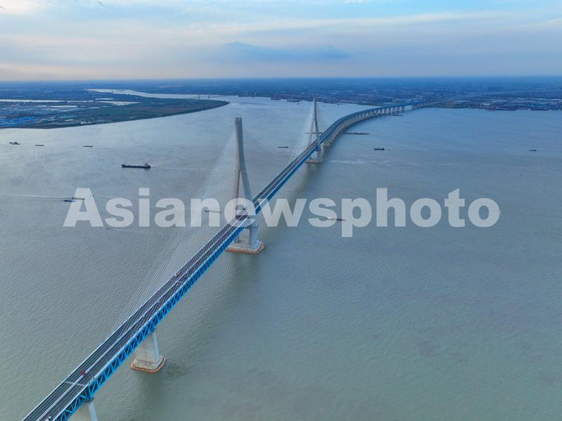 2022年6月10日,江苏南通,无人机航拍沪苏通长江公铁大桥画面。