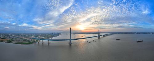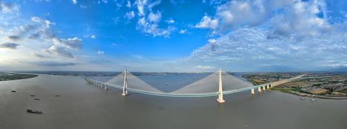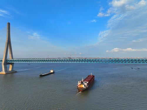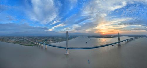 2022年6月10日,江苏南通,无人机航拍沪苏通长江公铁大桥画面。