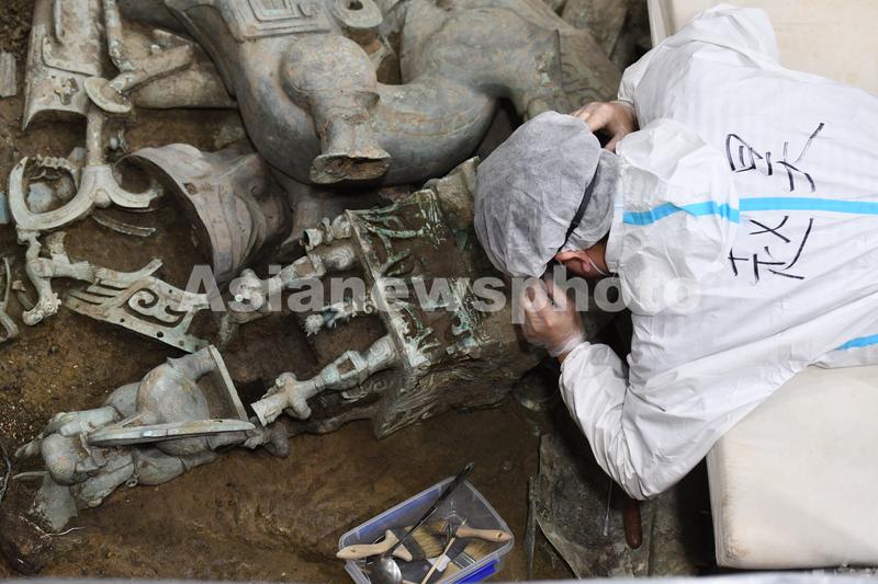 三星堆祭祀坑8号坑发掘现场负责人赵昊正在清理青铜神坛上的泥土。(5月31日摄)