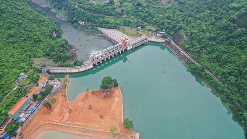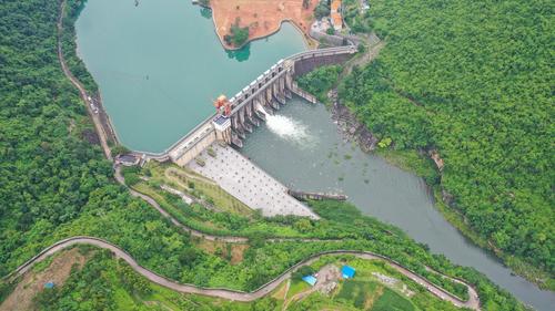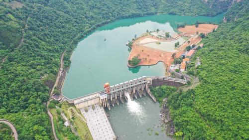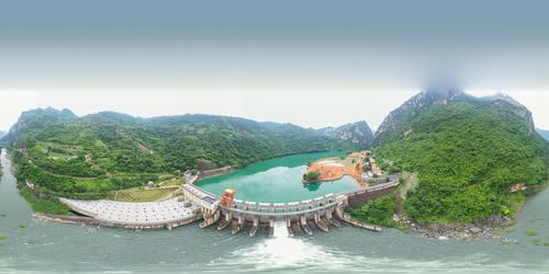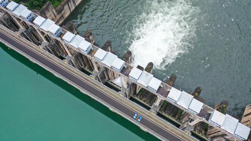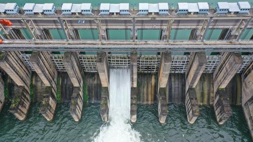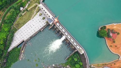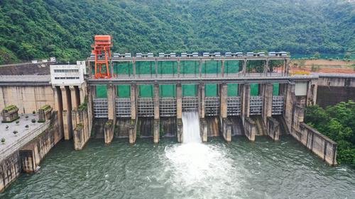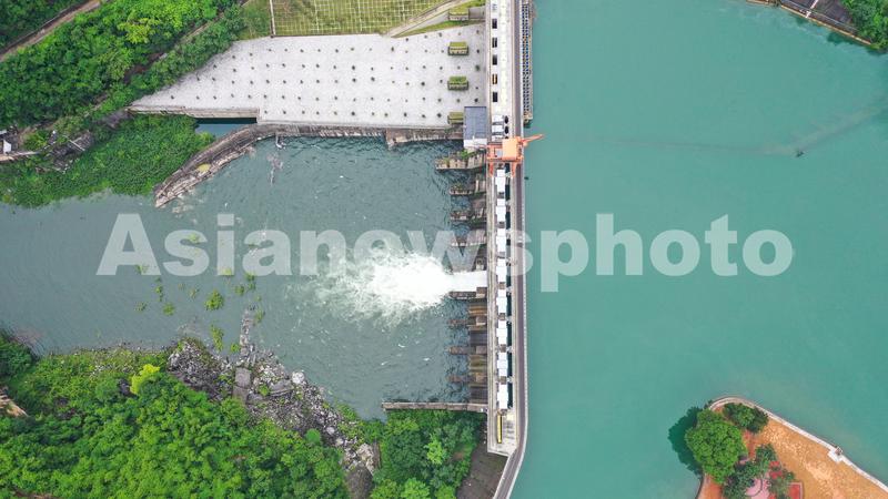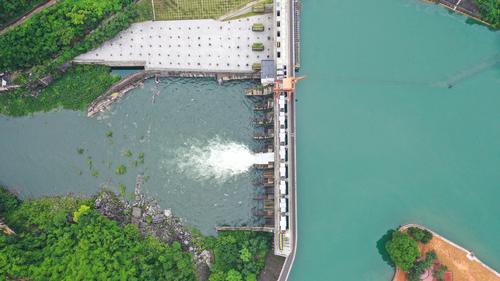 图片说明:6月16日,航拍位于贵州省黔西南布依族苗族自治州安龙县万峰湖镇的天生桥二级水电站开闸泄洪。