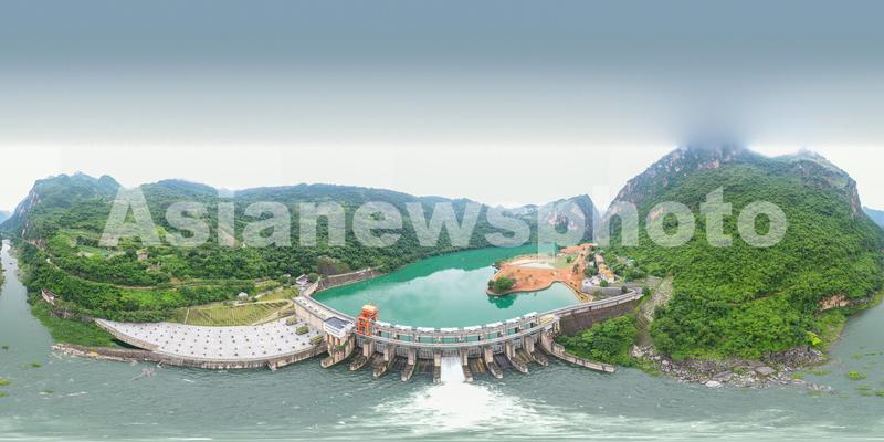 图片说明:6月16日,航拍位于贵州省黔西南布依族苗族自治州安龙县万峰湖镇的天生桥二级水电站开闸泄洪。