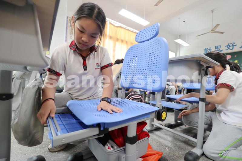 2022年6月16日,浙江省湖州市德清县雷甸镇中心小学通航校区学生在调整可折叠课桌椅。