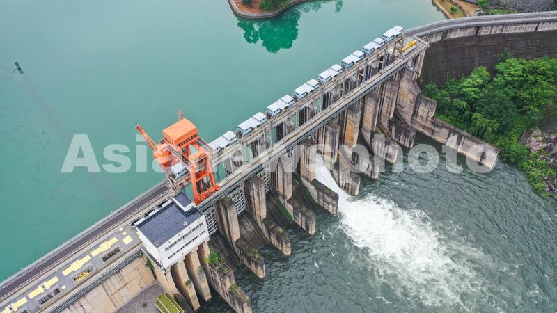 图片说明:6月16日,航拍位于贵州省黔西南布依族苗族自治州安龙县万峰湖镇的天生桥二级水电站开闸泄洪。