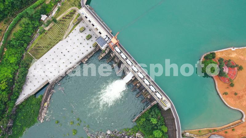 图片说明:6月16日,航拍位于贵州省黔西南布依族苗族自治州安龙县万峰湖镇的天生桥二级水电站开闸泄洪。