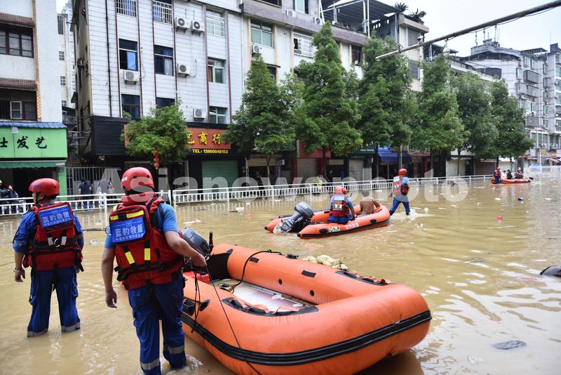 图片说明:6月19日,在位于福建省南平市建瓯市水南桥附近,蓝豹救援队利用橡皮艇转移被困群众。
