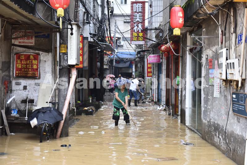 图片说明:6月19日,在位于福建省南平市建瓯市水南桥附近,居民在进行清淤工作。