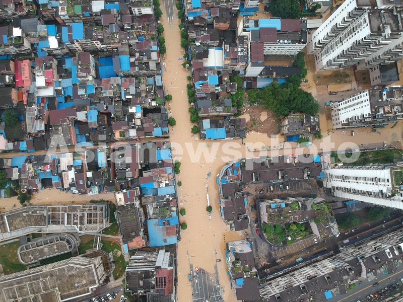 图片说明:6月19日,航拍洪水过境的福建省南平市建瓯市城区。