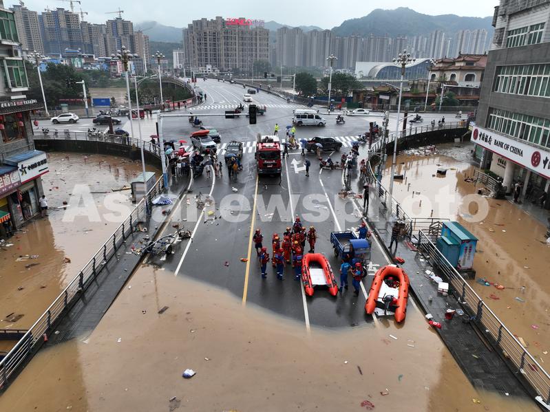 图片说明:6月19日,在位于福建省南平市建瓯市水南桥附近,蓝豹救援队开展救援工作。