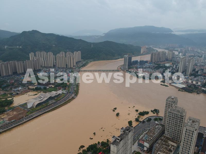 图片说明:6月19日,航拍洪水过境的福建省南平市建瓯市城区。