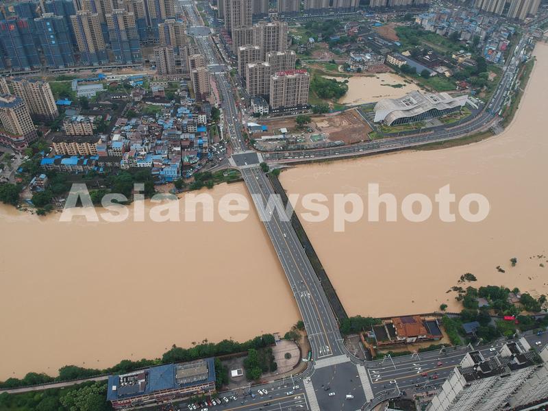 图片说明:6月19日,航拍洪水过境的福建省南平市建瓯市城区。