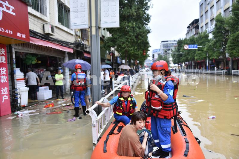 图片说明:6月19日,在位于福建省南平市建瓯市水南桥附近,蓝豹救援队利用橡皮艇转移被困群众。