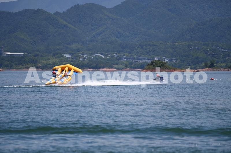 图片说明:2022年6月17日,随着气温的升高和国内疫情防控形势趋稳,浙江省杭州市淳安县珍珠半岛千岛湖水上运动项目日渐火热,游客在青山绿水之间休闲游玩,享受水上运动的快乐。