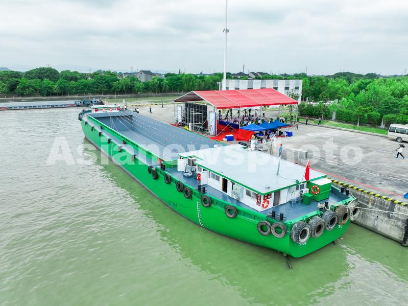 2022年6月20日,浙江省湖州市长兴县吕山乡长兴华能电厂码头,国内首艘两千吨级集散两用新能源运输船“东兴100”举行交船仪式。