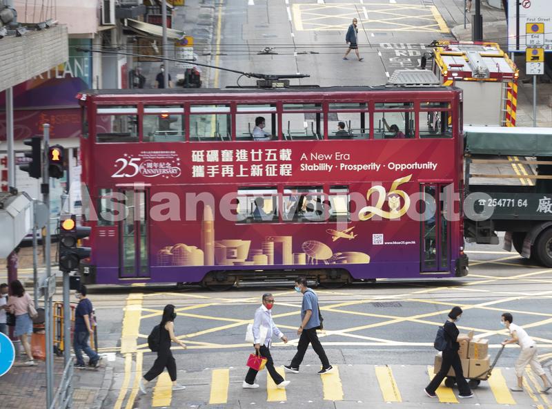 图片说明:6月15日,叮叮车上庆祝香港回归祖国25周年海报。