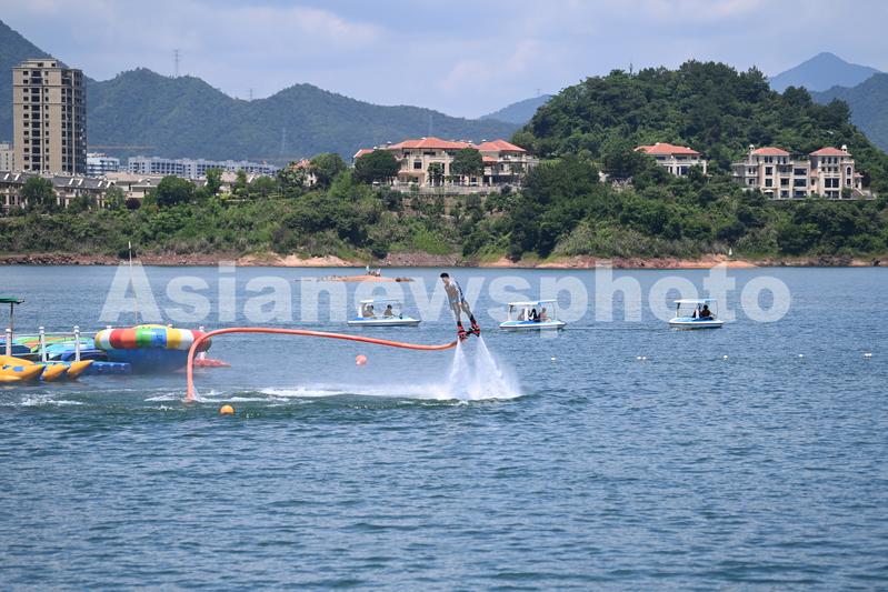 图片说明:2022年6月17日,随着气温的升高和国内疫情防控形势趋稳,浙江省杭州市淳安县珍珠半岛千岛湖水上运动项目日渐火热,游客在青山绿水之间休闲游玩,享受水上运动的快乐。