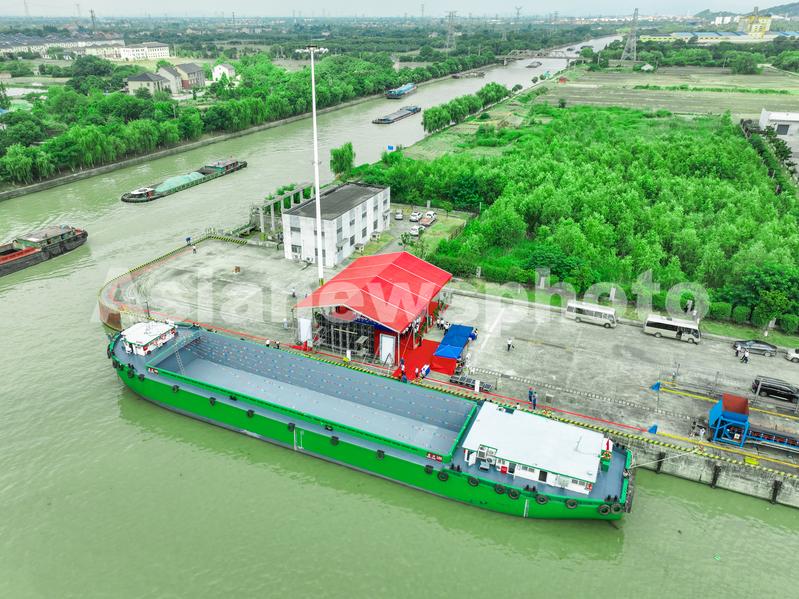 2022年6月20日,浙江省湖州市长兴县吕山乡长兴华能电厂码头,国内首艘两千吨级集散两用新能源运输船“东兴100”举行交船仪式。