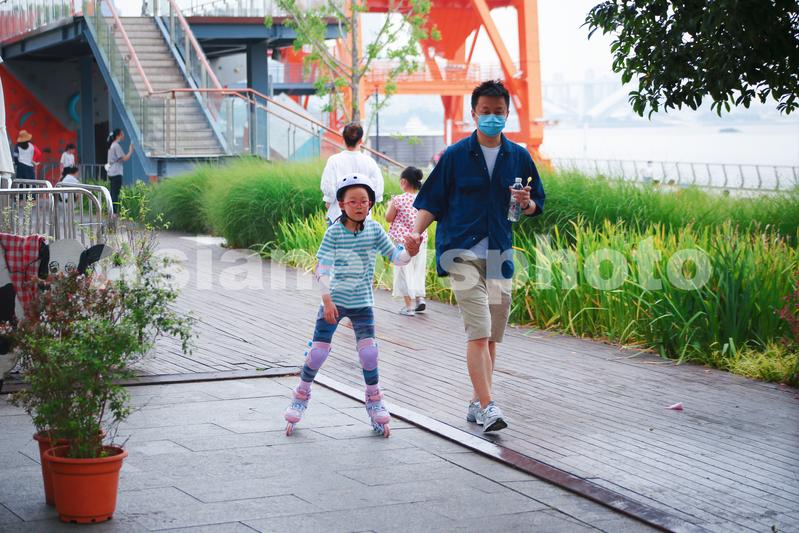 2022年6月19日,上海,徐汇滨江休闲健身公园恢复人气与活力,家长带着孩子在黄浦江边感受轮滑运动。