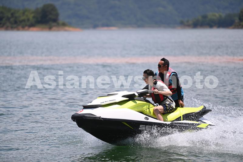 图片说明:2022年6月17日,随着气温的升高和国内疫情防控形势趋稳,浙江省杭州市淳安县珍珠半岛千岛湖水上运动项目日渐火热,游客在青山绿水之间休闲游玩,享受水上运动的快乐。