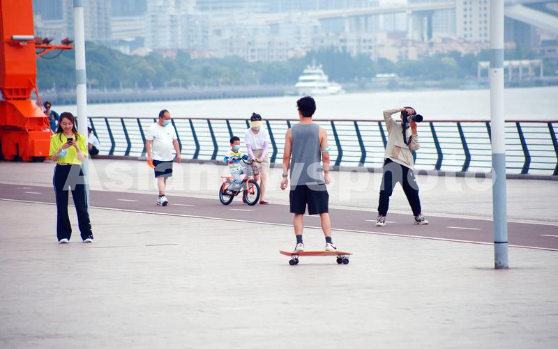 2022年6月19日,上海,徐汇滨江休闲健身公园恢复人气与活力,虽然天气阴沉,依然挡不住在家封闭已久的众多市民户外运动锻炼的热情。众多骑行、跑步、滑板、轮滑、独轮车爱好者们在这里放飞自我,感受新鲜空气,打造健康身体。