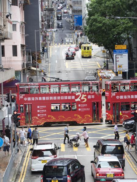 图片说明:6月15日,叮叮车上庆祝香港回归祖国25周年海报。