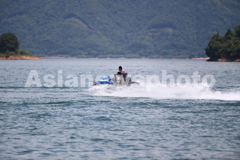 图片说明:2022年6月17日,随着气温的升高和国内疫情防控形势趋稳,浙江省杭州市淳安县珍珠半岛千岛湖水上运动项目日渐火热,游客在青山绿水之间休闲游玩,享受水上运动的快乐。