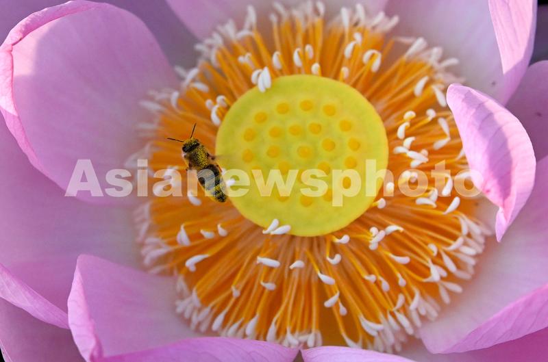 图片说明:6月21日,在河北省邯郸市龙湖公园的荷塘,蜜蜂飞舞在花间。