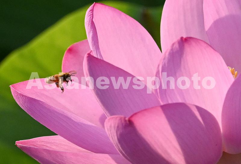图片说明:6月21日,在河北省邯郸市龙湖公园的荷塘,蜜蜂飞舞在花间。