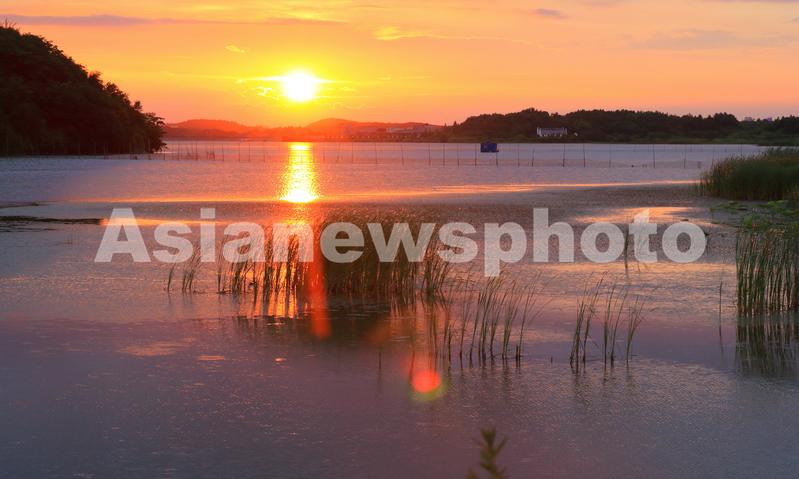 图片说明:2022年6月21日,安徽省合肥市庐江县罗河镇青山湖湿地保护小区水映霞光,景色如画。