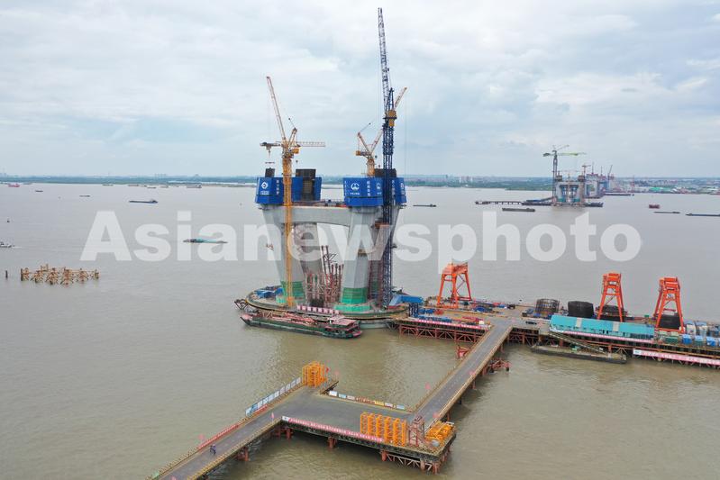 2022年6月22日,在江苏省常州市新北区拍摄的常泰长江大桥南主塔施工现场。