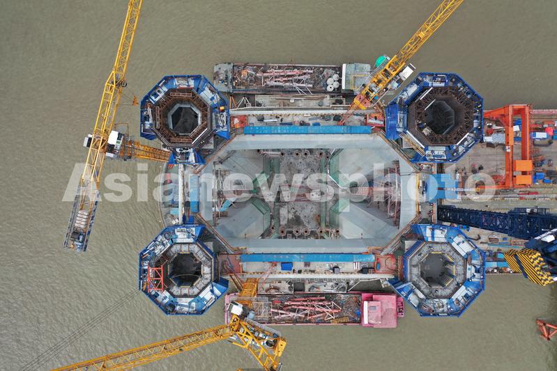 2022年6月22日,在江苏省常州市航拍建设中的常泰长江大桥。由中铁大桥局承建的常泰长江大桥连通江苏省常州市和泰兴市,是长江上首座集高速公路、城际铁路、一级公路“三位一体”的过江通道。大桥上层桥面布置为6车道高速公路,设计时速100公里;下层桥面上游侧布置为2线城际铁路,设计时速200公里;下层桥面下游侧布置为4车道一级公路,设计时速80公里。